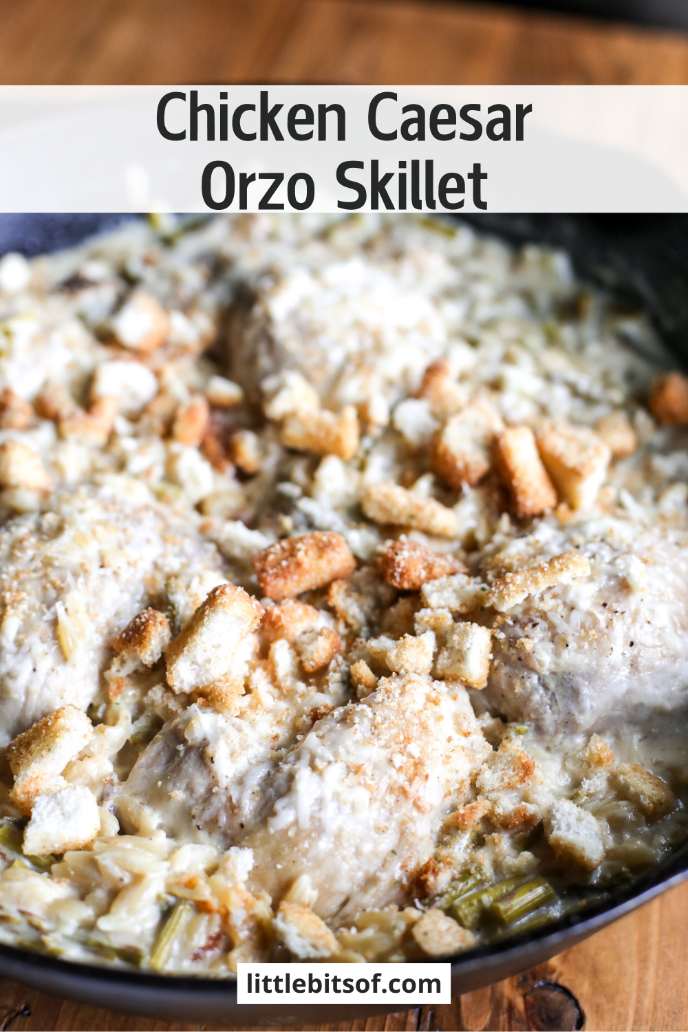 Be sure to pin this Chicken Caesar Orzo Skillet to cook for later.