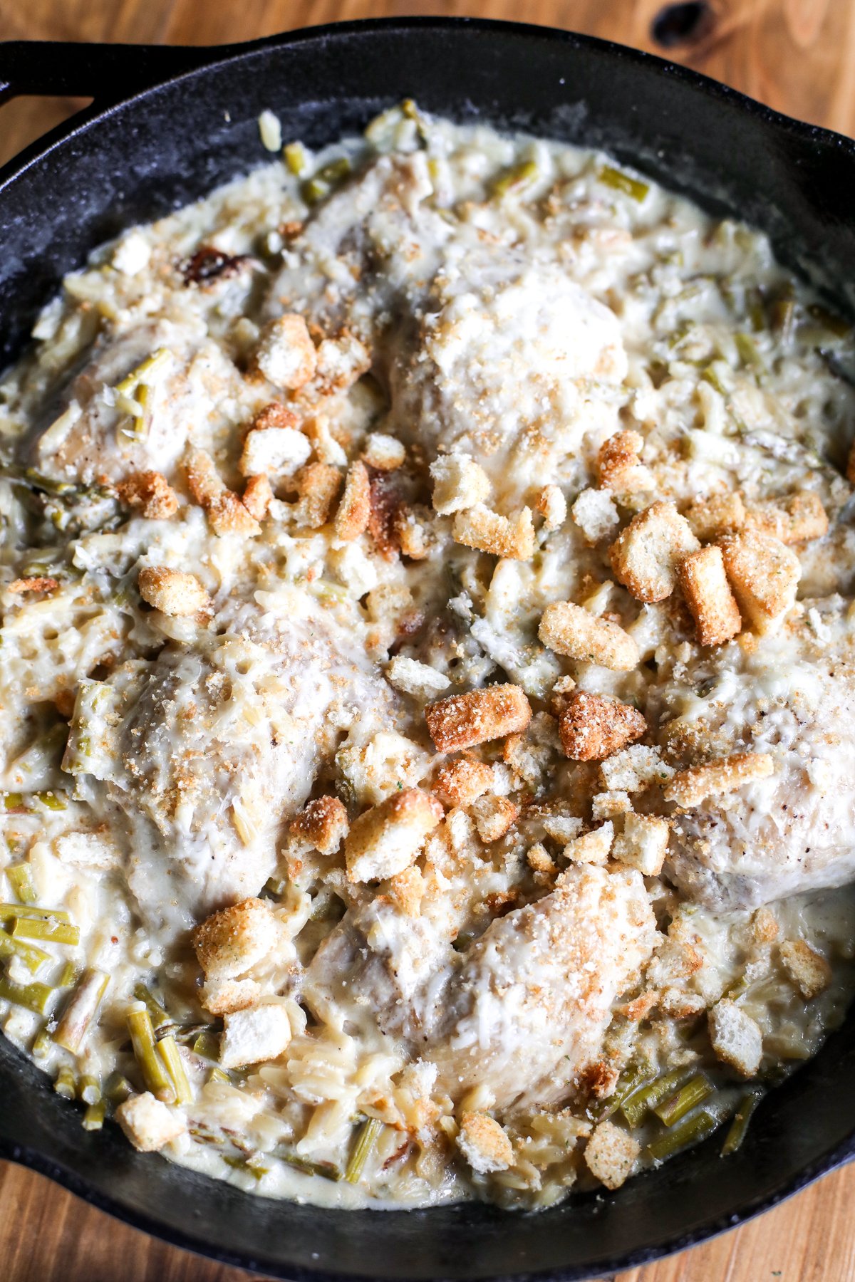 Turn Caesar salad into a cozy one-pan meal! Tender chicken, orzo, and asparagus in a creamy, savory dressing sauce.