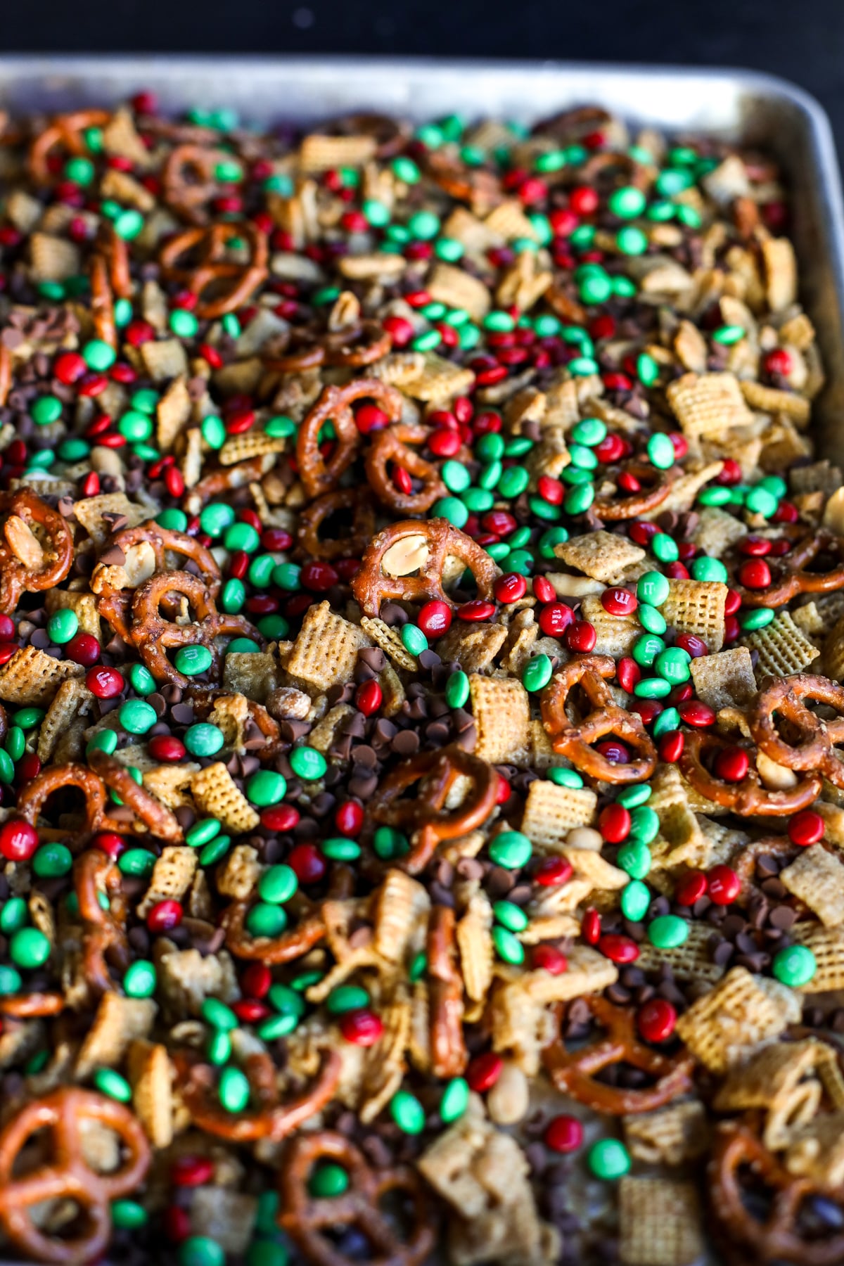 This crunchy, sweet Christmas Crack Chex Mix is addictive! An easy holiday recipe with buttery toffee, pretzels, and M&Ms.